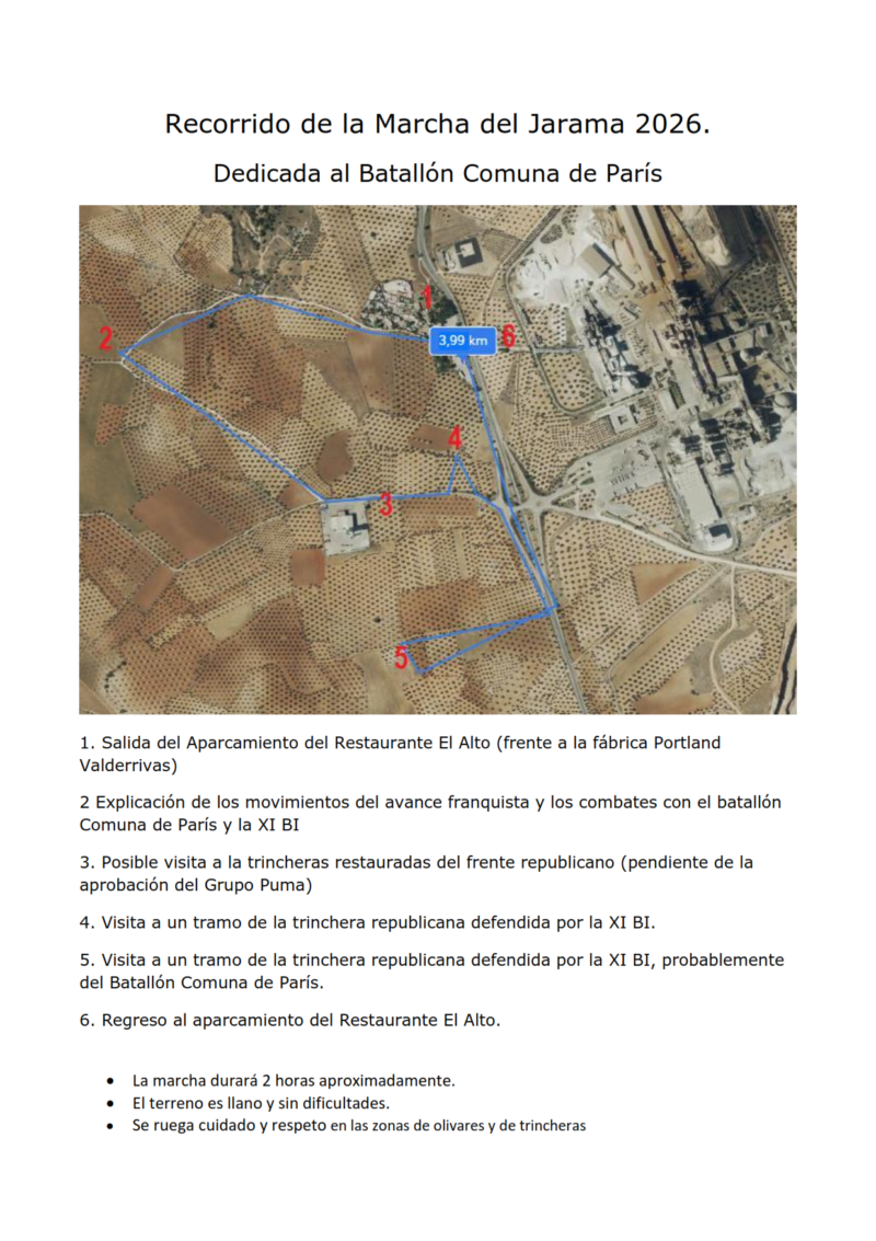 10:15 – 11:45h: Recorrido por los lugares donde participo el batallón “Comuna de Paris”; nuestro guía será Miguel Ángel García que nos irá explicando los aspectos más relevantes de la batalla.